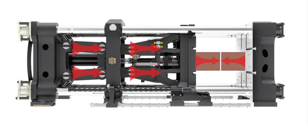 La sección de inyección adopta el método de inyección horizontal de vástago de tornillo único. La sección de moldeo de sujeción adopta un dispositivo rotativo horizontal de tres posiciones de trabajo. Puede producir continuamente múltiples cámaras con un solo molde, tiene alta eficiencia.